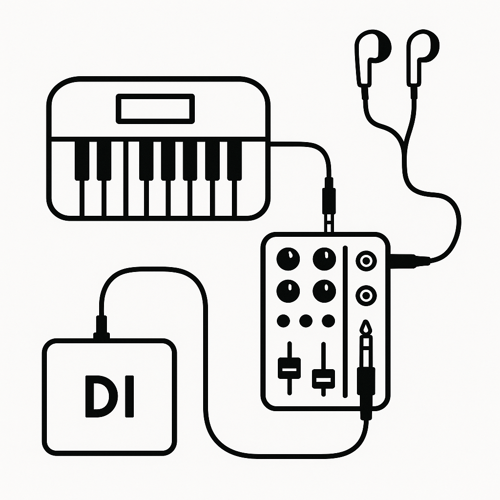 音声出力端子が限られているので、ライブで使う際には注意が必要です。ライブハウスではミニプラグの入力に対応していることが少なく、標準プラグで信号を送る必要があります。小型のミキサーを用意し、ヘッドフォン端子から音声を送り、ミキサーからイヤフォンモニターとDIへの信号を分岐、というかたちがいいかもしれません。